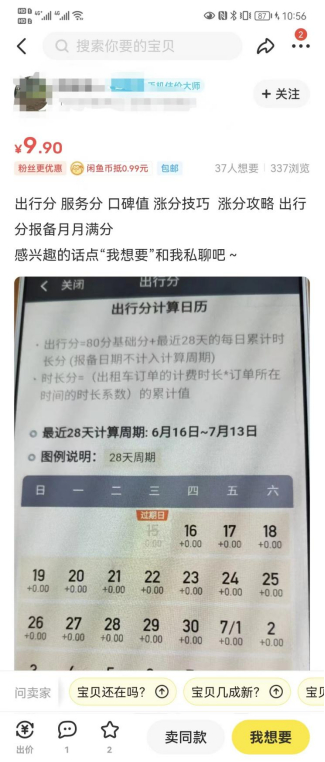 除了出售跑车经验,记者发现平台上还在出售网约车司机涨分攻略,根据卖家的描述,按照攻略操作的话,可以使司机月月都能通过考核达到满分。据了解,网约车平台一般会对司机进行月度考核,通过出行分、服务分、口碑值等来评价司机是否合格。这也会直接影响到司机的派单量,一旦考核不达标就会减少派单。