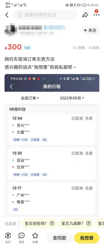 在某交易平台记者发现,有的卖家甚至出售无责取消订单的方法,这样也可以保证服务分不会被扣除。对此,记者与网约车司机沟通了解到,他们也不想取消订单,只不过有时候平台派单较远,存在空车返回的风险,因此会选择一些方式进行无责取消。据了解,出行平台一天会给一次无责取消的机会,如后续接到不好的订单时,司机通常会通过与乘客沟通看乘客语气是否和蔼,来选择要不要协商由乘客取消订单,或者编一些理由,如电量不足无法前往目的地等。如遇到实在不想接的乘客,一般会躲在乘客不容易找到的地方,时间过长便可无责取消。