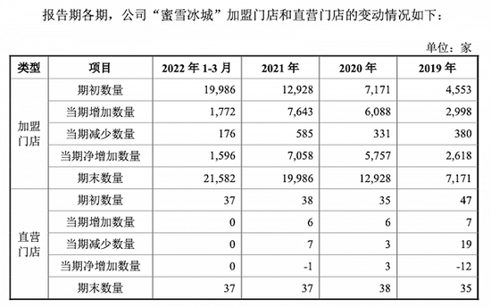 报告期各期末,公司门店总数分别为7225家、13126家、20511家及 22276家,其中仅有47家为直营。蜜雪冰城已是庞然大物——作为对比,招股书显示同样走加盟模式的古茗、书亦烧仙草门店数目前分别为6600家、6500家。