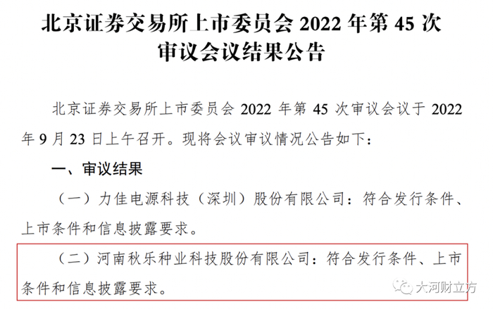 9月23日,北交所披露上市委员会2022年第45次审议会议结果公告,秋乐种业符合发行条件、上市条件和信息披露要求。