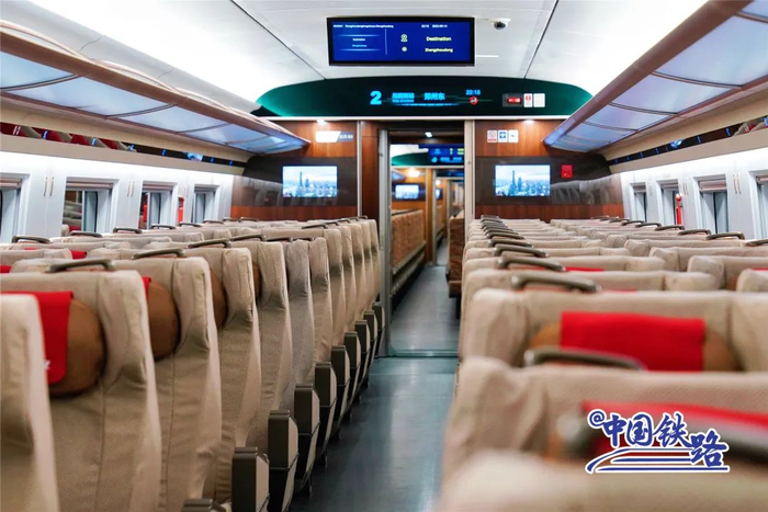 长编组复兴号智能动车组共有16节车厢,全车定员为1195人。其中商务座定员24人,一等座定员148人,二等座定员1023人。