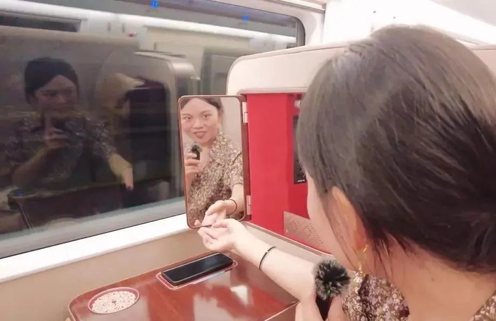 在靠背一侧还配备了梳妆镜,让您在高铁列车上也能美美哒。