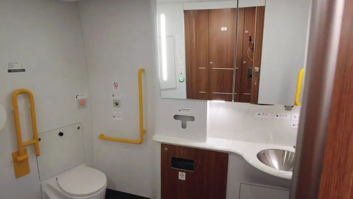 卫生间配备智能照明,当检测到有人进出后会自动调节灯光明暗。旅客锁门时,会自动播放广播,提醒旅客不要在此吸烟。