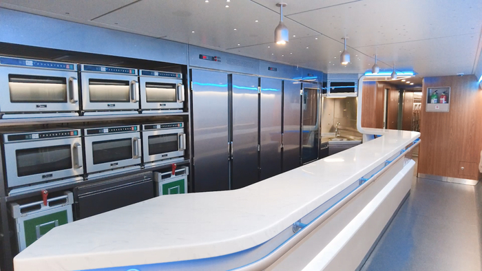 9号车厢是列车餐吧半开放式的设计,拉近了餐车服务员与旅客的距离。餐车车顶的“星光闪烁”搭配蓝色灯带,为旅客提供了更加美观时尚的环境。