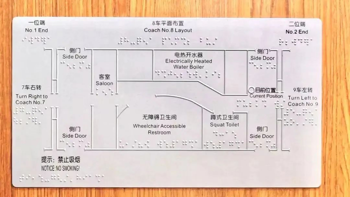 同时,在座椅扶手上、卫生间等地方配有盲文标识。