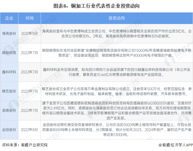 近年来,我国铜加工行业发展迅速,行业内企业投资动向主要包括新增项目扩大产能、向产业链下游延伸等。代表性企业投资动向如下: