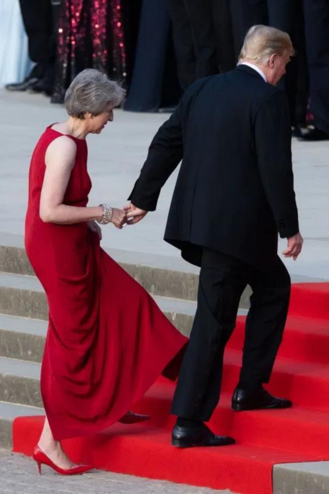 2018年,特朗普访问英国。梅在首相乡间别墅会见他。这次,她穿了一身红色长裙——发型倒是没变,还是短发奶奶灰。