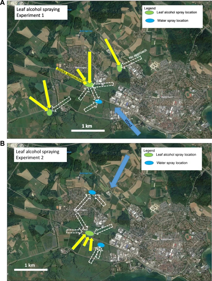 白鹳起飞靠近喷洒了割草味混合物的地图展示,蓝色区域为洒水的位置,绿色是割草味的位置(作为对比),黄色箭头是白鹳的飞行方向及距离。图片来源:文献4