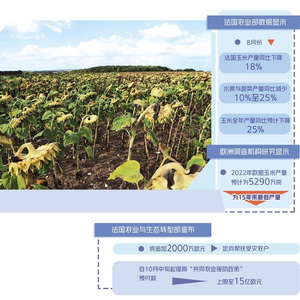一是直接冲击粮食收成。法国农业部统计数据显示,在农产品领域,法国今年8月份玉米产量同比下降18%,全年产量同比预计下降25%,为1990年以来的最低水平,水果与蔬菜产量减少10%至25%。法国蒙彼利埃国家农艺研究所研究室主任弗朗索瓦·塔迪尼指出:“虽然各农业部门的情况不尽相同,但干旱带来的整体冲击已不可避免。”尤其今夏以来,小麦、大麦、油菜等平均收成偏低,如小麦收成不足3340万吨。作为世界主要小麦出口国,法国的减产也将对国际小麦市场造成外溢影响。法国农业原材料市场专家塞巴斯蒂安·彭瑟莱指出:“对于春季播种的夏季作物,如玉米、向日葵等,干旱的影响将更为巨大,甚至是灾难性的。”