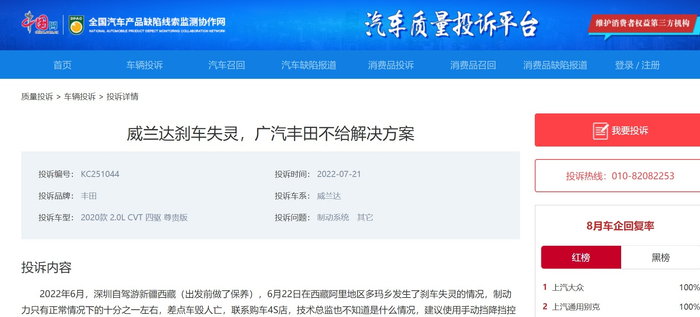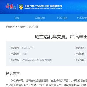 中国网汽车9月 日讯 (记者 朱古力)都说上了高原人有高原反应,轻则失眠、乏力、头晕眼花,重则感冒、发烧、头痛欲裂。那么车上了高原,会不会有什么反应呢?今年7月,中国网汽车质量投诉平台(https://315.auto.china.com.cn/) 接到丰田威兰达车主戴先生的投诉称“威兰达‘刹车失灵’,广汽丰田不给解决方案”。据戴先生描述,2022年6月,他从深圳自驾游前往新疆、西藏地区,出发前专门为爱车做了保养,而就在6月22日,车辆便在西藏阿里地区多玛乡发生了“刹车失灵”的情况,制动力只有正常情况下的十分之一左右,差点车毁人亡!