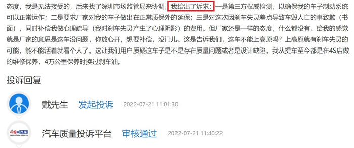 本就刚经历过一场凶险,厂家如此态度,对车主来说无异于雪上加霜,戴先生着实无法接受。随后找到深圳市市场监督管理局协调,并提出自己的三条诉求。