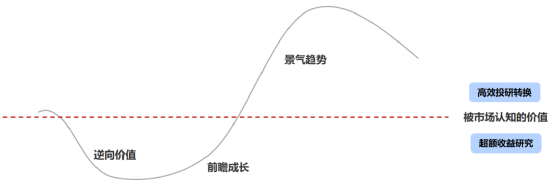叶峰:虽然每只股票受到外力和内力的影响都可能会产生波动,通过比较概念化的处理我画了这样一张图,表示股票价格的回归周期,即围绕着“被市场认知的价值”波动。在不同的时点买入,可概括为不同的风格,在左侧下跌区间买入为“逆向价值”,在上升初期买入为“前瞻成长”,在上涨完全形成后买入为“景气趋势”。在不同的股票领域,我往往会做不同的操作: