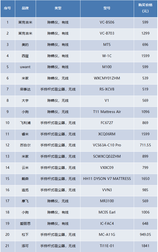 样品由工作人员以普通消费者的身份从电商平台购买,涉及18个品牌的21个样品,其中除螨仪类样品11台,带有除螨刷头的手持杆式吸尘器类样品10台。购买价格从519元/台—1841元/台不等。