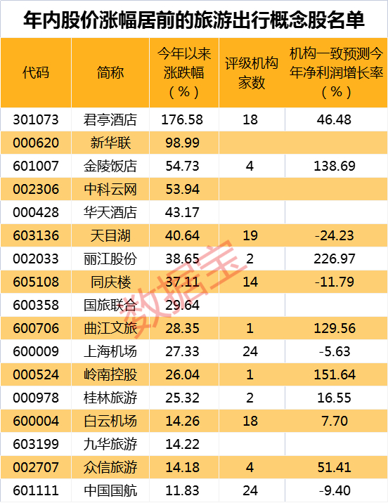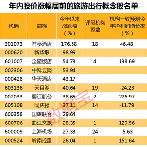 证券时报·数据宝梳理,旅游出行相关概念股有48只,年内股价表现来看,仅君亭酒店一股的股价翻倍上涨,新华联、金陵饭店、中科云网的股价年内累计上涨超50%。
