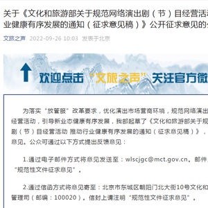 据“文旅之声”微信公号26日消息,为落实“放管服”改革要求,优化演出市场营商环境,规范网络演出剧(节)目经营活动,引导新业态健康有序发展,文旅部起草了《文化和旅游部关于规范网络演出剧(节)目经营活动推动行业健康有序发展的通知(征求意见稿)》,现公开征求意见。公众可通过以下方式提出反馈意见: