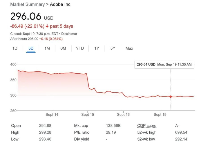 但此消息一出,这笔交易不仅没有得到“祝福”,反而两家公司都受到了巨大冲击。Adobe这边,当天股价暴跌了超过17%,创造了该公司2010 年以来最大跌幅。二级市场投资人并不看好这笔收购,一是因为这笔收购可能导致Adobe大规模举债,另外他们也对Adobe是否能运营好Figma 存疑。