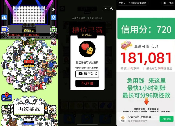该游戏将玩家的“胜负欲”与广告进行了紧密关联,玩家要想“复活”或使用道具,需要不断被迫收看广告。“虽然没能通关,但众鑫贷款等一些贷款公司的广告词倒是背会了,‘最高额度20万’等信息极具诱惑力,放贷资质、利率等不明真假。”上述90后白领表示。