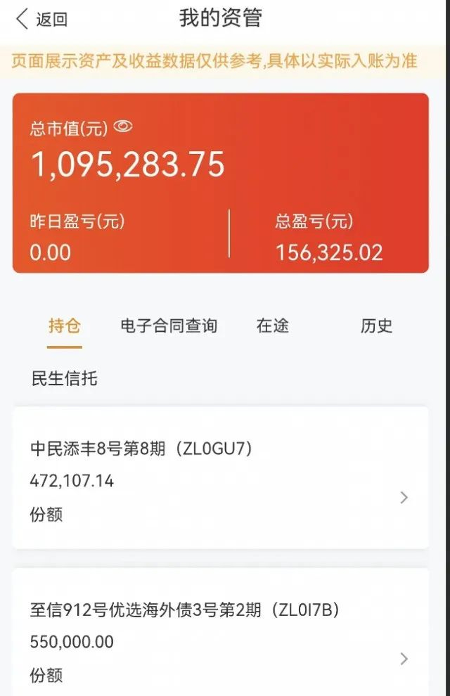 “今天来的本金有的在三、五十万的,我们当地有个最高的是一千万。”有投资者将自己在该行的资管服务页面打开显示,其于2021年下半年购买了该行代销的“中民添丰8号第8期”和“至信912号优选海外债3号第2期”产品。