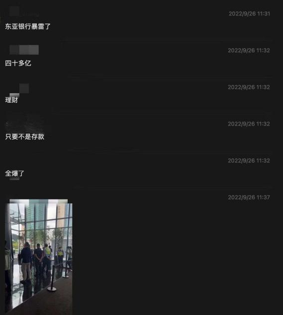 9月26日,一则“东亚银行爆雷了”相关内容的微信聊天记录在网上流传。网传消息称,该行“除了存款、其他理财产品均发生爆雷”。