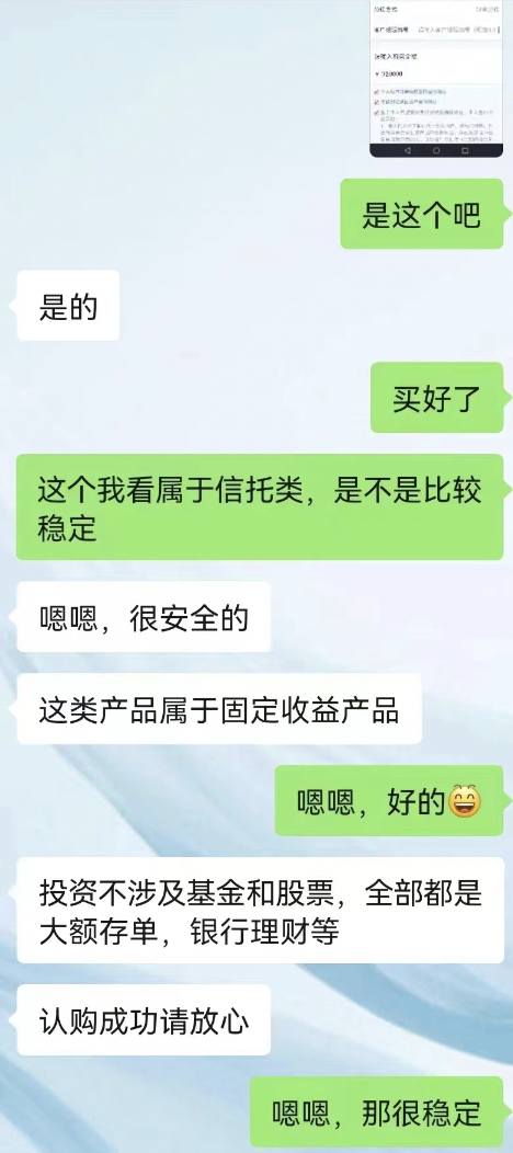 “理财经理当时说产品风险低,属于固定收益类,投资全部是大额存单、银行理财,让我放心,也没告诉我这就是信托类产品。”有投资者表示,在没有详细介绍产品情况与提示风险的情况下,投资者在银行理财经理的“很安全”、“保本保息”的推荐下进行了购买。