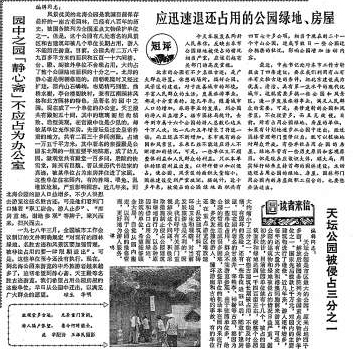 上世纪80年代,北京部分公园和古建筑物被占用,实地采访后,北京日报记者编发了读者来信《园中之园“静心斋”不应占为办公室》,并且配写短评《应迅速退还占用的公园绿地、房屋》,刊发在1980年6月10日的《北京日报》头版。