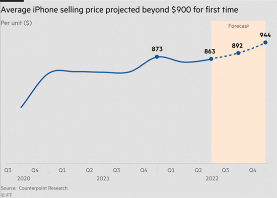 根据Counterpoint Research的预测,本月早些时候苹果发布iPhone 14系列手机,需求旺盛,预计ASP(平均售价)将会在9月份所在季度创下新高,达到892美元;12月份所在季度再次攀升,达到944美元(约合人民币6728元)。去年四季度,iPhone的ASP曾达到873美元。
