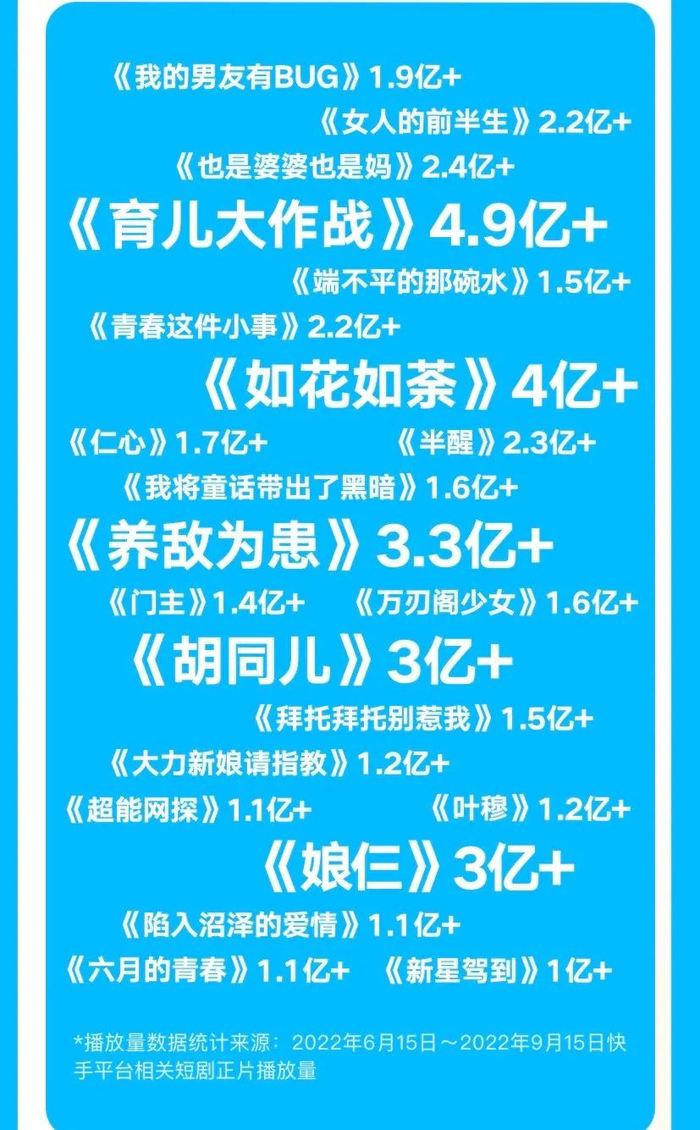 并涌现了《育儿大作战》4.9亿+、《如花如荼》4亿+、《养敌为患》3.3亿+、《胡同儿》《娘仨》3亿+等爆款精品,在题材拓展、多样商业化、全网营销玩法等维度实现新的突破。