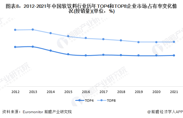 目前,越来越多的厂商把目光投向软饮料行业,之前没有进入这一市场的玩家,例如伊利、蒙牛都将通过推出新产品进入这一市场。根据Euromonitor数据显示,2012-2019年,中国软饮料行业历年TOP4和TOP8企业的市占率呈下降趋势;2019-2020年,TOP4和TOP8企业的市占率保持稳定;2021年,TOP4和TOP8企业的市占率略微上升,可见软饮料市场格局已基本稳定。