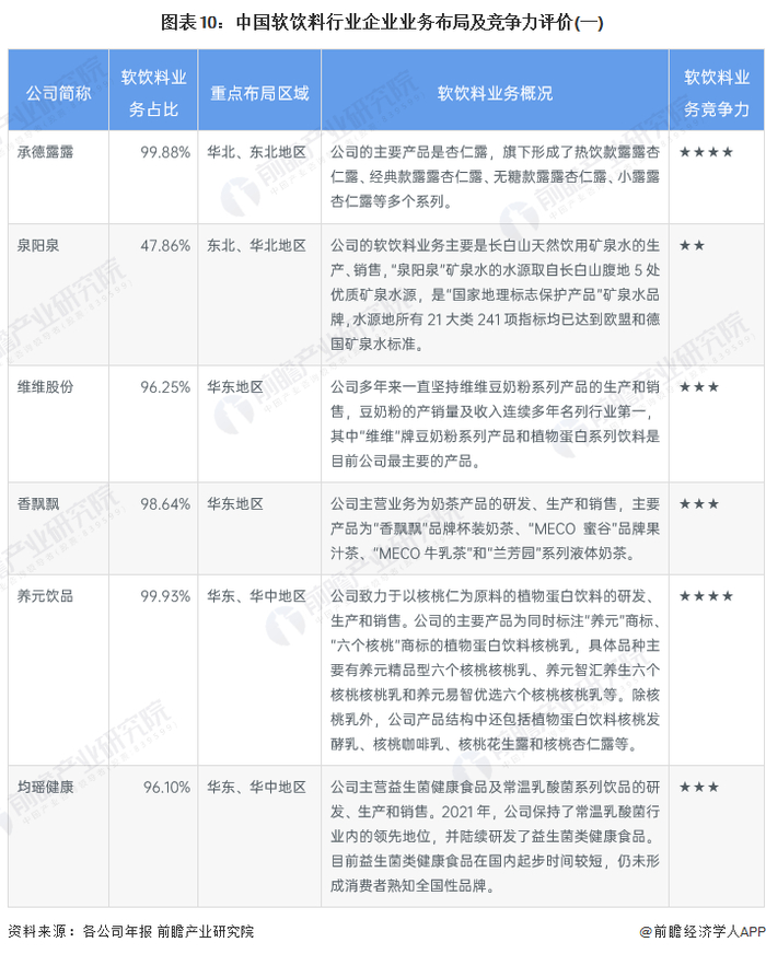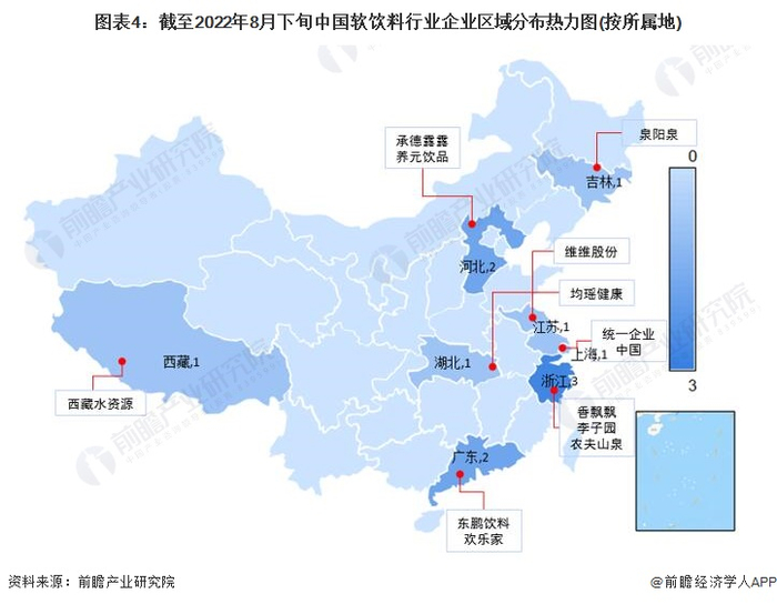 软饮料行业公司中,中国广核、中国软饮料的软饮料业务布局最广,这两家企业重点布局在长三角、珠三角地区。其他上市公司则基本通过参股方式参与软饮料业务的经营。