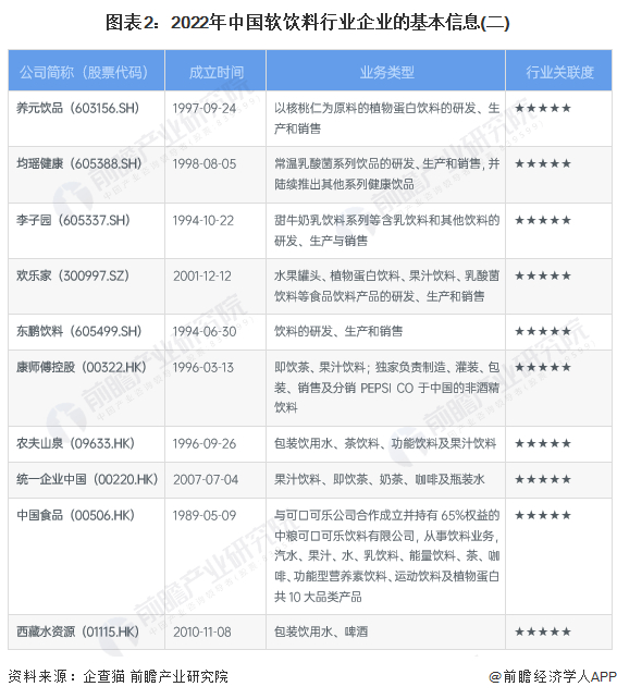 目前,我国软饮料行业的上市企业主要包括:承德露露(000848.SZ)、泉阳泉(600189.SH)、维维股份(600300.SH)、香飘飘(603711.SH)、养元饮品(603156.SH)、均瑶健康(605388.SH)、李子园(605337.SH)、欢乐家(300997.SZ)、东鹏饮料(605499.SH)、康师傅控股(00322.HK)、农夫山泉(09633.HK)、统一企业中国(00220.HK)、中国食品(00506.HK)、西藏水资源(01115.HK)。