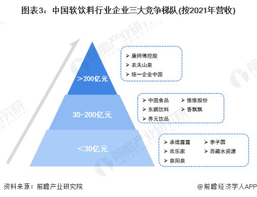在快速发展过程中,中国软饮料行业整体规模、品牌影响力不断攀升。软饮料行业依据企业在2021年的营业收入划分,可分为3个竞争梯队。其中,营业收入大于200亿元的企业有康师傅控股、农夫山泉、统一企业中国;营业收入在30-200亿元之间的企业有中国食品、东鹏饮料、养元饮品、维维股份、香飘飘等;其余企业的营业收入在30亿元以下。