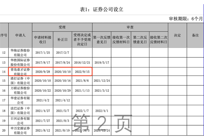 根据证监会公布的证券、基金经营机构行政许可申请受理及审核情况,青岛意才证券申请设立的材料已于9月15日获证监会受理。而这距离其申请材料接收,历时约两年。