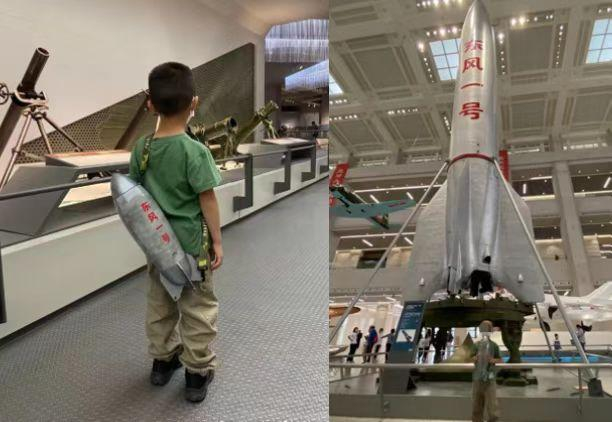 网友带孩子逛军博与“东风一号”真品合影。(网络图)