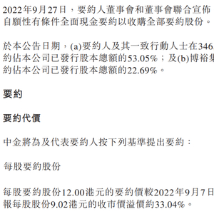 根据公告,每股要约股份12.00港元的要约价较2022年9月7日(即最后交易日)在联交所所报每股股份9.02港元的收市价溢价约33.04%。