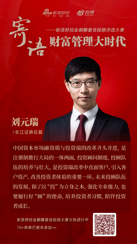 长江证券总裁刘元瑞受邀成为本次大赛的评审委员会成员之一。他认为,中国资本市场融资端与投资端的改革齐头并进,是注册制推行大局的一体两面,投资顾问制度、投顾队伍的培养与壮大,是投资端改革中直面客户、引入客户资产、改善投资者体验的重要一环。未来投顾队伍的发展,除了以“投”为立身之本,强化专业能力,也要履行好“顾”的使命,培养投资者习惯,陪伴投资者成长。期待此次大赛通过专业、公开、公平、公正的方式,评选出一批品行端正、专业过硬、表达良好的优秀投顾,作为中国财富管理行业的杰出代表,帮助广大投资者树立科学、理性的投资理念,掌握正确投资方法,为整个财富管理行业树标杆、立规矩、定标准。祝新浪财经.金麒麟投顾大赛成功举办。更多评委的精彩观点,尽请关注首届金麒麟最佳投资顾问评选大赛。