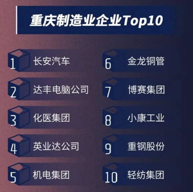 2022重庆企业100强排名前三位的分别是龙湖集团(00960.HK)、长安汽车(000625.SZ)和金科集团。其中,长安汽车以2021年营业收入2150亿元,连续19年蝉联重庆制造业企业100强“冠军”;龙湖集团则同时夺得2022重庆服务业企业100强第一名。