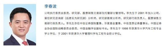 李先生亦任中信证券国际董事、华夏基金董事、中信里昂证券董事长、中国证券业协会国际战略委员会委员、中国金融学会副秘书长。