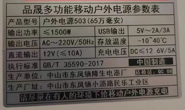 记者在时女士提供的涉事电源移动电源铭牌看到,该款产品由中山市东凤镇隆生电器厂生产,执行标准为GB/T35590-2017。据广东省电子数码行业协会负责人邹元兴介绍,这项标准的适用范围是“充电宝等功率较小的产品”。