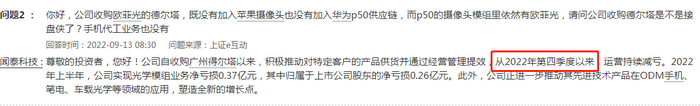 “公司光学模组业务自2021年12月份正式启动双摄产品供货以来,一直在持续供货,并通过经营管理提效实现运营持续减亏。公司正在与客户积极推动新型号产品业务。”张学政说。