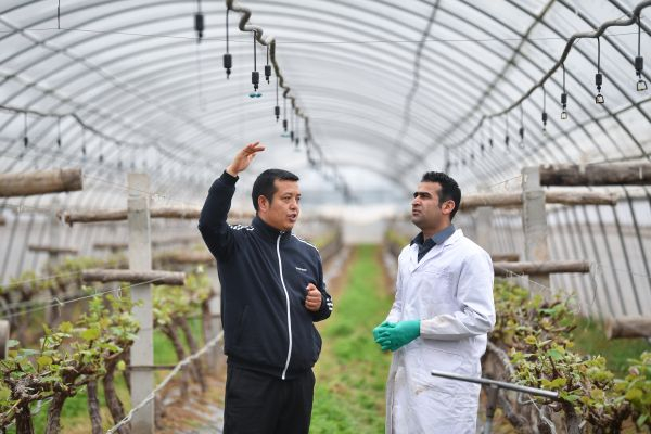 2021年3月17日,来自巴基斯坦的留学生(右)在陕西杨凌锦田农业专业合作社向当地职业农民了解水肥一体化灌溉设备。(新华社发)