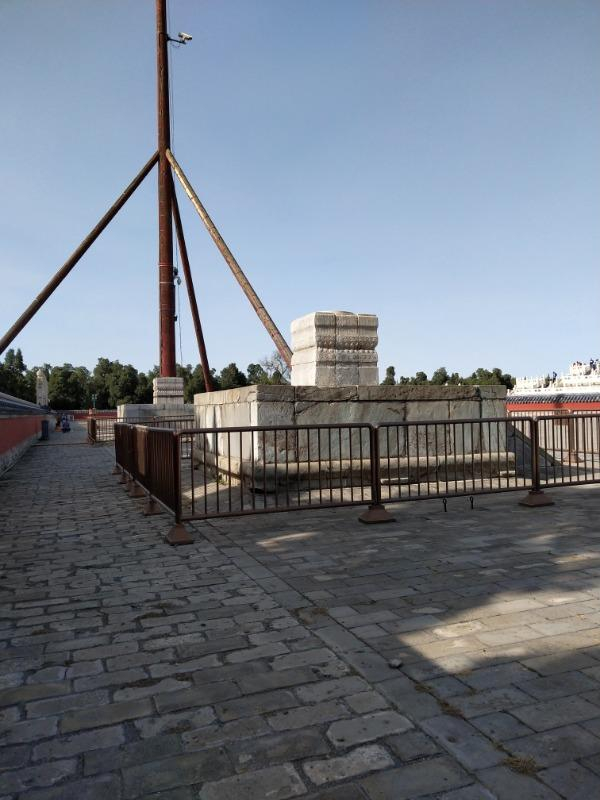 望灯杆石座也称望灯台,青石砌造,正方形,台高1.7米,边长约5米,台上中心竖以白色巨石,石高约1.5米,厚逾0.9米,两块巨石对峙,中间有圆形空隙,用以插装望灯杆,故称“夹杆石”。1994年天坛恢复了圜丘北面的一根望灯杆,复建的望灯杆为钢管,红漆包镶木,上覆鎏金宝顶,架以品字形戗杆。复建的望灯杆高达32米,极壮观。同时,按中间一座旧有饱经沧桑的望灯石座形制复建了南、北两座望灯石座。每座望灯均置有保护栏,护栏内均有插灯杆雕花石一尊、拽拴望灯绳索铸铁环两个。