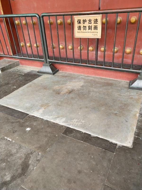 祈年殿第三层汉白玉圆台上,南半部铺墁的扇面形金砖,凹凸不平,大部分已碱蚀。这些金砖做工粗糙,许多露出土黄色内痕,与乾隆时包砌天坛内坛墙青灰色城砖质地截然不同,疑为光绪十六年重建祈年殿时所铺墁。皇乾殿地面铺设的金砖质地与皇穹宇东西配殿铺墁的金砖基本相同,推测系嘉靖年间的御窑金砖。