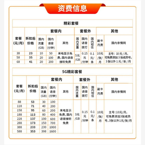 目前两种套餐均打6折促销,折扣后套餐的价格最低为23元/月(原价38元/月),包含10GB国内流量和50分钟国内语音通话;最高为353元/月(原价588元/月),包含398GB国内流量和1600分钟国内通话。