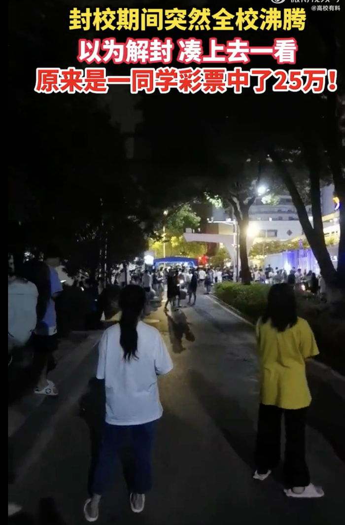 九派新闻了解到,视频里同学们起初在校内奔走的情形与中奖无关,是以为学校西门开放、恢复了常态化管理,可以自由进出后的场景。