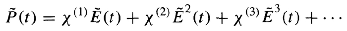 对于整个固体来说,偶极子带来的贡献叫做极化强度,通过一些复杂的求解可以知道,极化强度P的表达式可以写成外加电场E的幂求和,幂指数对应几阶非线性效应,前面的系数被称为非线性系数[6]。