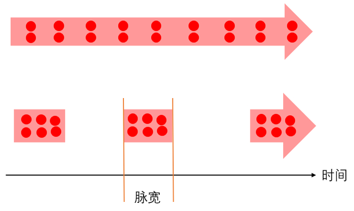 对于一束连续光,所有的光子均匀分布在整束光中。而对于脉冲光,光子只存在于脉冲持续的这段时间里。
