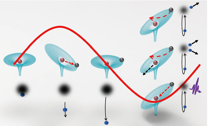高次谐波产生的三步示意图,其中最右边上面两幅图是被加速电子额外与其他电子或原子的碰撞过程,最下面一幅图代表被加速电子与原子复合辐射高次谐波。图片来源:参考文献[5]。