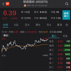 截至9月27日收盘,软控股份股价上涨4.41%,报6.39元/股,总市值为61亿元。