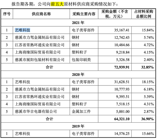 艺唯科技在过去三年一直是力玄运动的第一大供应商,报告期内其供应金额占材料采购总额比例分别是15.66%、18.15%、15.84%。