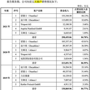 《招股书》显示,2019-2021年,公司对前五大客户的销售收入占营业收入总额的比例分别为84.77%、86.99%、84.78%,客户集中度较高,经营风险较为集中。